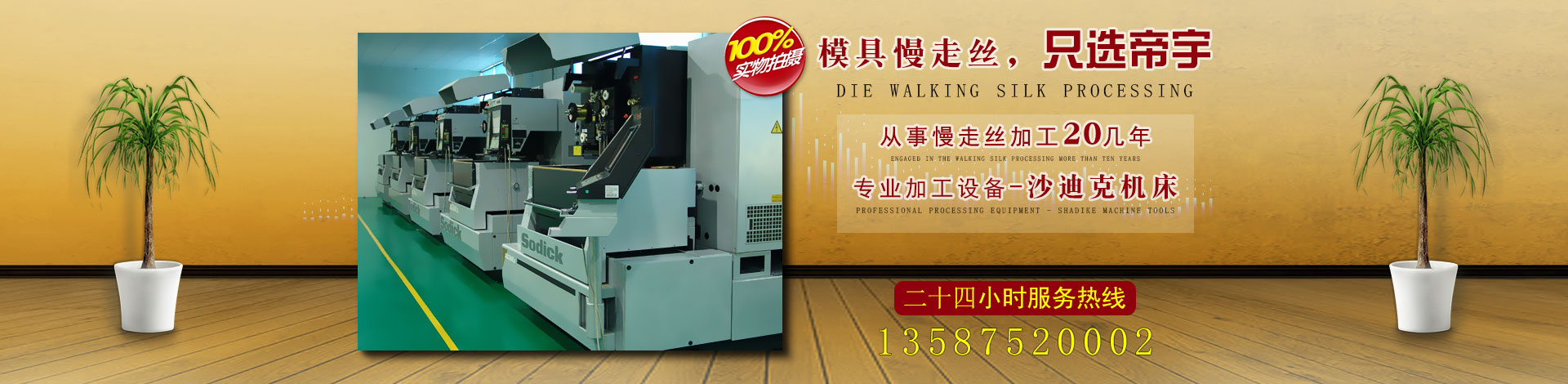 帝宇公司創立于2001年,座落在中國汽摩配之都-浙江省瑞安市塘下鎮,專業從事慢走絲加工,公司擁有日本高精度沙迪克系列慢走絲切割機臺、測量儀等系列加工檢測設備。